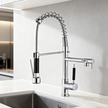 Robinet de cuisine de style commercial bec à ressort double sortie Rotation à 360 ° Construction en laiton Plusieurs finitions disponibles